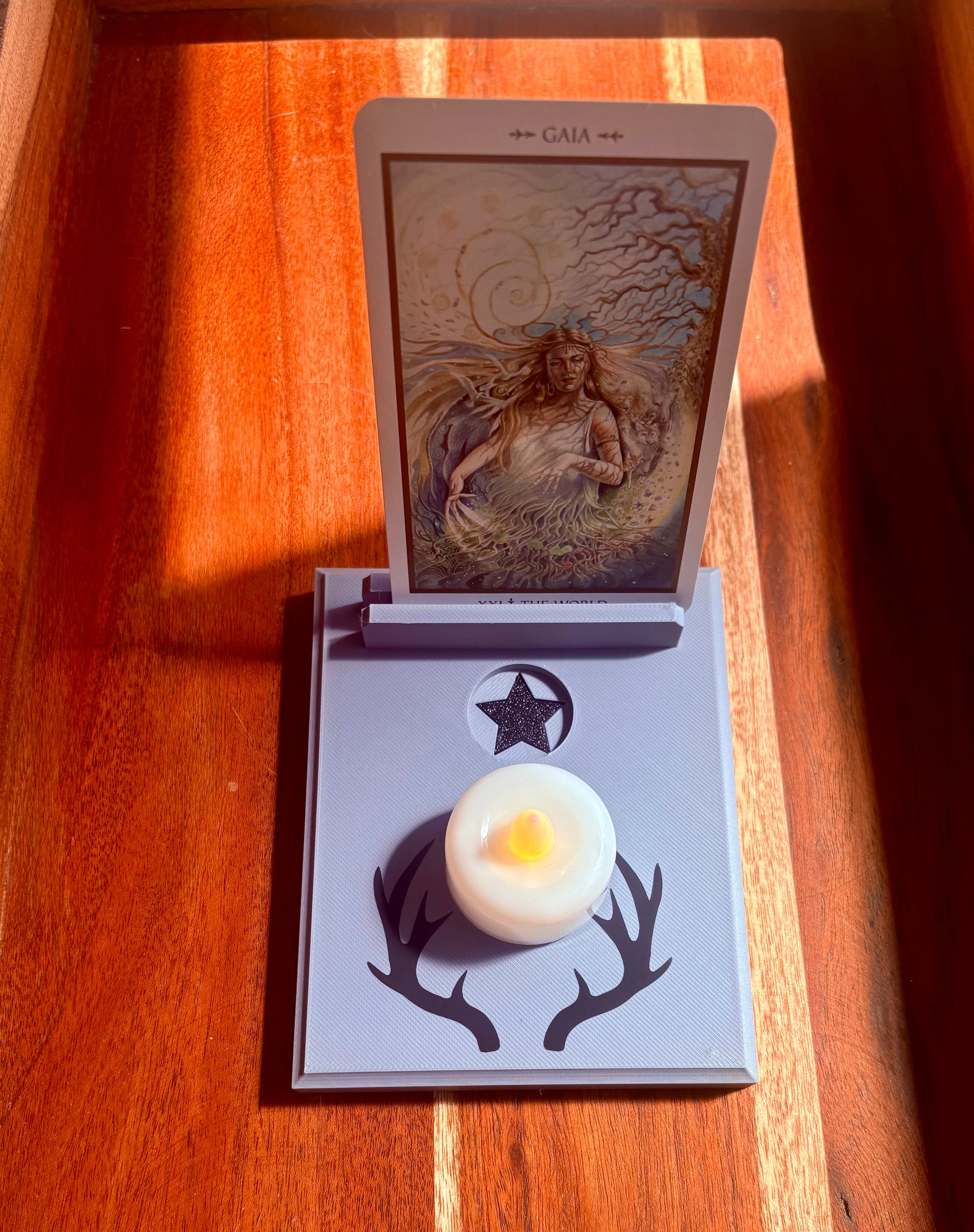 Rooted in the quiet strength of the forest, the Wildwood Tarot Card Holder brings a touch of untamed magic to your altar. Crafted in grey with a bold black star inset and antler design, this piece is a grounding way to display a single card for meditation, spellwork, or ritual focus. Each holder comes with an electric tea light.