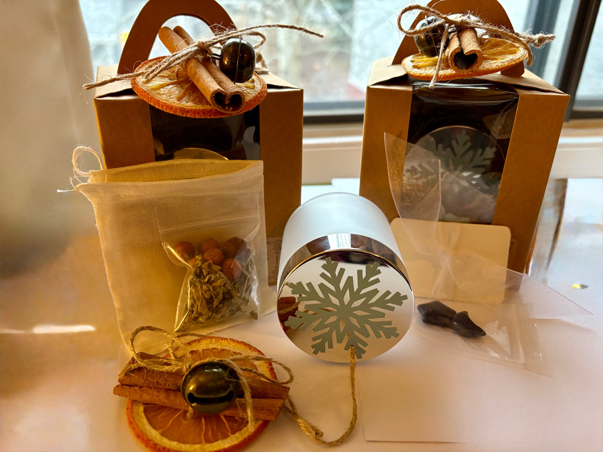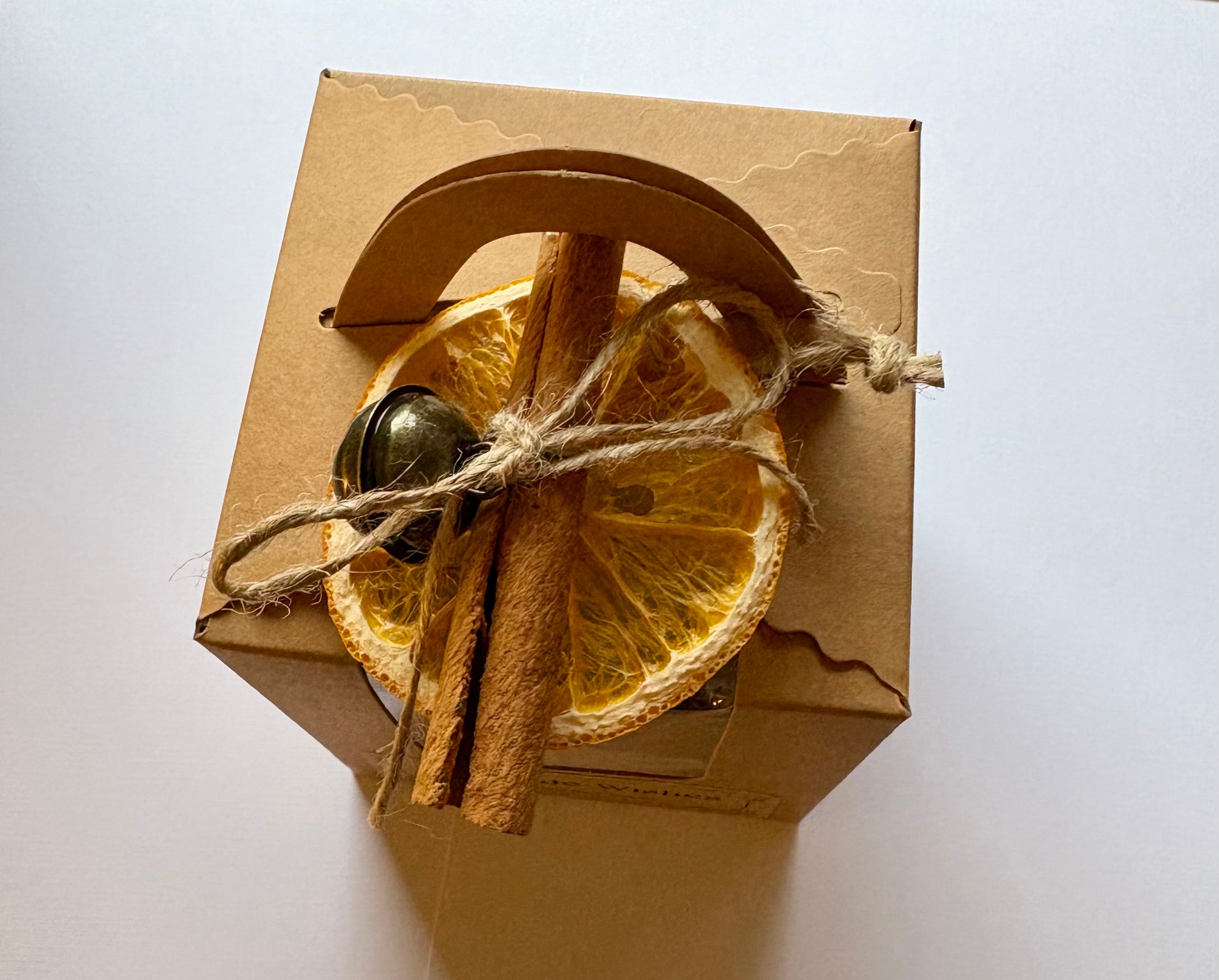 The kit comes with a ritual instruction card and is beautifully presented in a kraft window box with a scalloped handle. The outside is adorned with a dried orange slice, cinnamon stick, antique brass jingle bell, and a twine bow with a hanging loop — ready for gifting or placing on your altar.