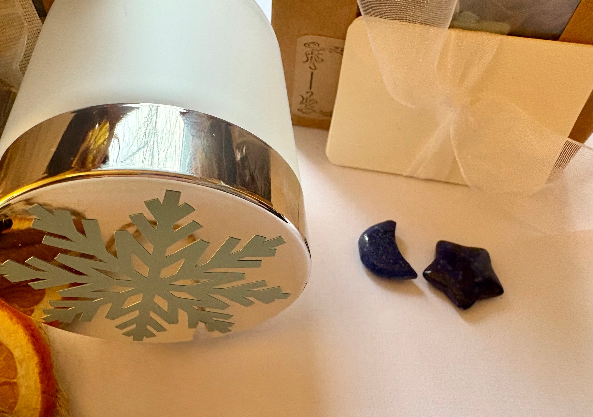 Each set includes a glass jar topped with a Cricut-cut blue snowflake vinyl, ready to hold your hopes for the turning year. Inside, you’ll find cardstock wish slips tied in chiffon ribbon, a stone moon and star, and a herbal sachet of mugwort and juniper for clarity, protection, and quiet winter dreaming.